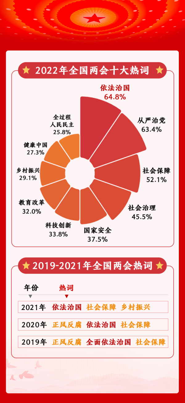 2022年,人民網(wǎng)開展的全國兩會調(diào)查評選出十大熱詞。調(diào)查結果顯示,“依法治國”“從嚴治黨”“社會保障”三大熱詞關注度位居前三位。其中,“依法治國”最受關注,選擇該熱詞的網(wǎng)民占比64.8%。