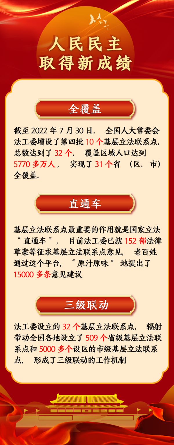 法工委設立的32個基層立法聯(lián)系點,輻射帶動全國各地設立了509個省級基層立法聯(lián)系點和5000多個設區(qū)的市級基層立法聯(lián)系點,形成了三級聯(lián)動的工作機制,搭建起了基層群眾共商共建共享的大舞臺。