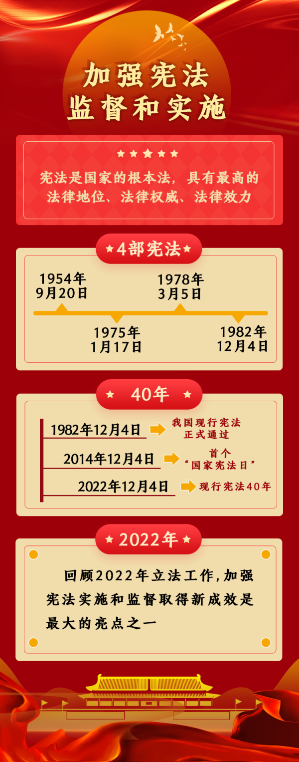 2022年是我國現(xiàn)行憲法公布施行40周年。這40年,也是我國改革開放深入推進、經濟社會迅速發(fā)展、人民生活水平不斷提高的40年。回顧2022年立法工作,加強憲法實施和監(jiān)督取得新成效是最大的亮點之一。具體包括,不斷健全保證憲法全面實施的制度體系,通過完備的法律保證憲法實施,嚴格落實合憲性審查制度機制,深入推進合憲性審查工作,更好發(fā)揮憲法在治國理政中的重要作用,維護憲法權威和尊嚴。