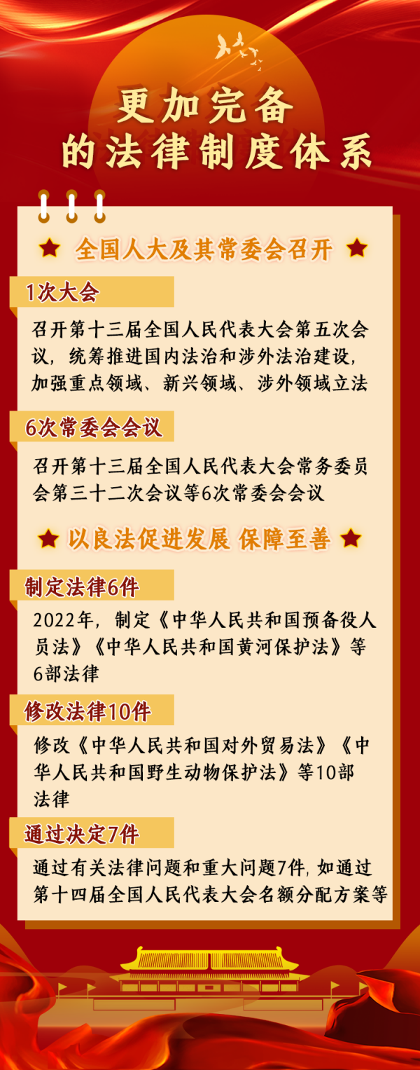 據(jù)統(tǒng)計,2022年,全國人大及其常委會召開了1次大會和6次常委會會議,統(tǒng)籌推進國內法治和涉外法治建設,加強重點領域、新興領域、涉外領域立法,制定法律6件,修改法律10件次,作出法律解釋1件,通過有關法律問題和重大問題決定7件,法律制度體系更加完備。