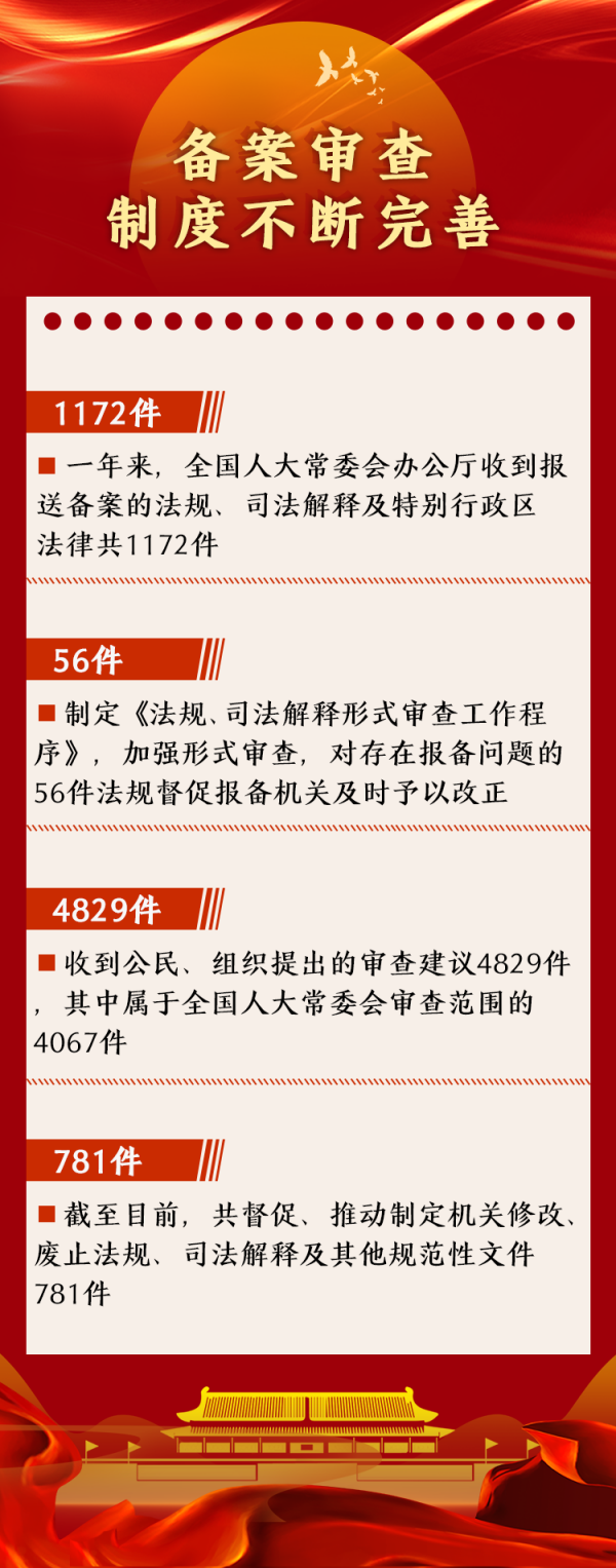 數(shù)字顯示,一年來,全國人大常委會辦公廳收到報送備案的法規(guī)、司法解釋及特別行政區(qū)法律共1172件。制定《法規(guī)、司法解釋形式審查工作程序》,加強形式審查,對存在報備問題的56件法規(guī)督促報備機關及時予以改正。收到公民、組織提出的審查建議4829件,其中屬于全國人大常委會審查范圍的4067件。