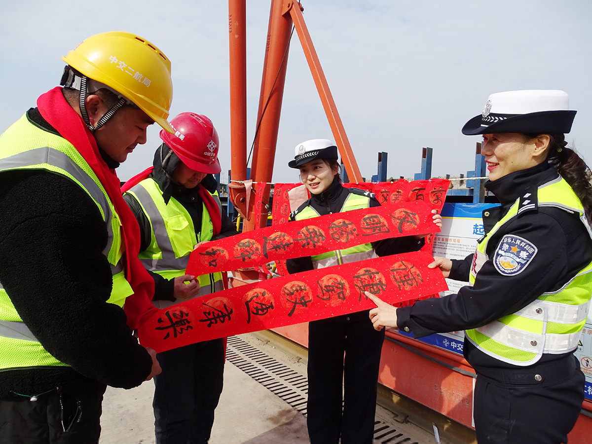 1月16日,安徽省蕪湖市公安局交警支隊鏡湖大隊組織開展“書寫春聯(lián)話平安”活動,民警走進轄區(qū)一處建筑工地現(xiàn)場書寫富含交通安全知識、新春祝福等內(nèi)容的春聯(lián)贈給工人,讓大家在歡樂中不忘自覺遵守交通法規(guī)。