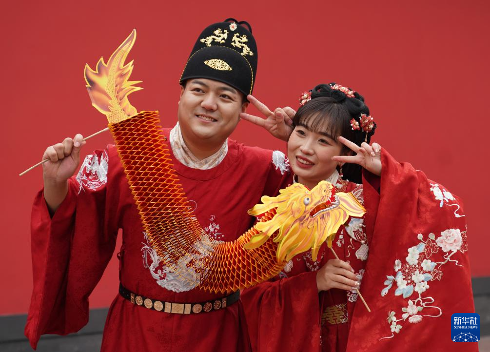 1月15日,杭州南宋德壽宮遺址博物館外,一對新人手持道具龍拍照。