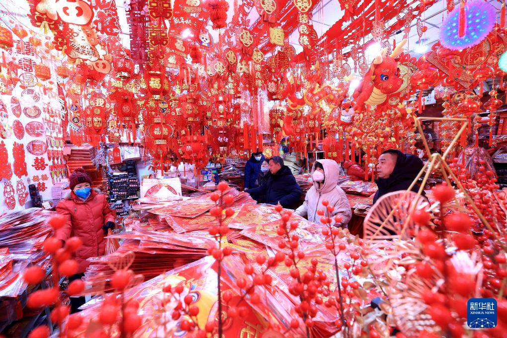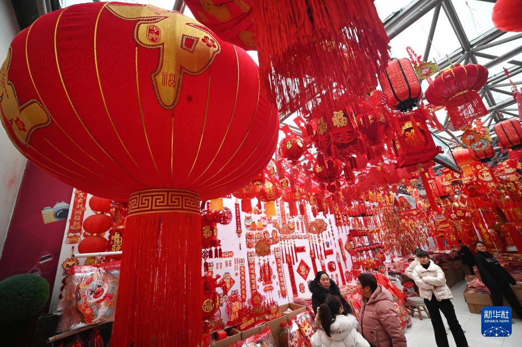 1月20日,人們?cè)诤颖笔∈仪f市南三條年貨批發(fā)市場(chǎng)選購(gòu)春節(jié)飾品。新華社發(fā)(梁子棟攝)