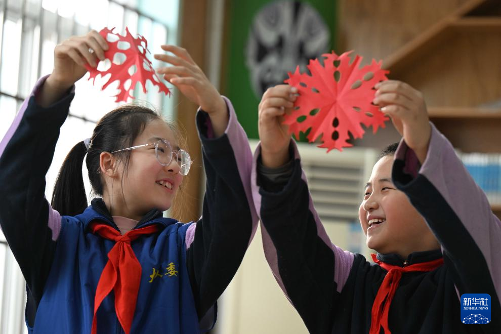 1月15日,河北省石家莊市裕華西路小學的學生在校園廟會活動中展示自己剪的窗花。