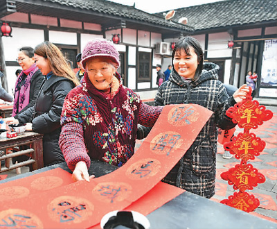 1月29日,四川省廣安市鄰水縣袁市鎮(zhèn)大光明社區(qū)的群眾在“翰墨迎春”文化下鄉(xiāng)活動現(xiàn)場領(lǐng)取春聯(lián)。張啟富攝(新華社發(fā))