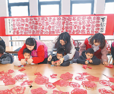 1月30日,浙江省湖州市長興縣李家巷鎮(zhèn)中心幼兒園的老師和志愿者帶著孩子們剪龍年新春窗花。新華社記者 徐昱 攝