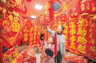 1月28日,江蘇省宿遷市宿豫區(qū)商貿(mào)城新年飾品賣場紅紅火火,年味十足;市民忙著挑選春節(jié)飾品,準備過年。徐江海攝(人民圖片)