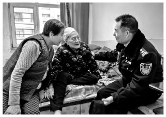 圖為民警王剛來到95歲的魏大娘家中進行春節(jié)慰問,并提供便民服務。