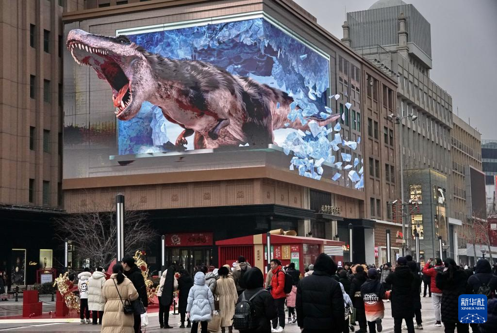 市民在王府井商業(yè)街觀看裸眼3D大屏幕的動(dòng)畫(2月2日攝)。