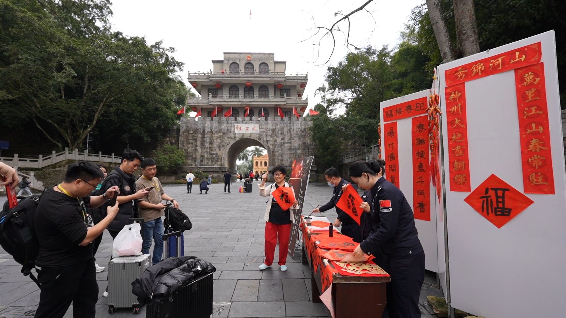 2月2日9時(shí),千年雄關(guān)友誼關(guān)前人頭攢動(dòng),出入境旅客絡(luò)繹不絕,一片熱鬧的景象。廣西出入境邊防檢查總站友誼關(guān)出入境邊防檢查站移民管理警察在此為廣大旅客寫(xiě)對(duì)聯(lián)送福字。