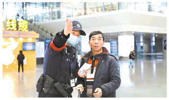 圖為南寧東站派出所執(zhí)勤民警在為旅客提供服務(wù)。