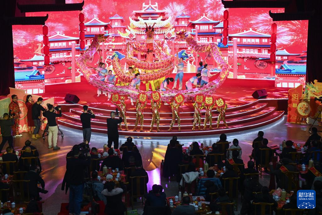 2月4日,來自湖州長興縣的農(nóng)民進(jìn)行鴛鴦龍表演。