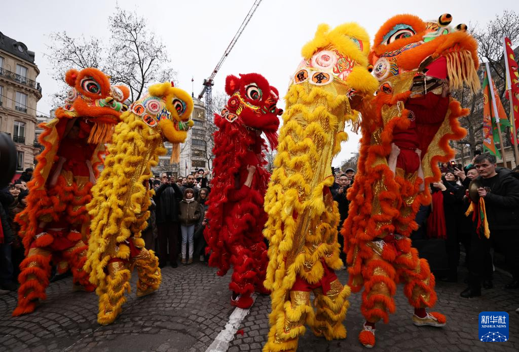 2月4日,人們?cè)诜▏?guó)巴黎香榭麗舍大街觀看舞龍舞獅表演。