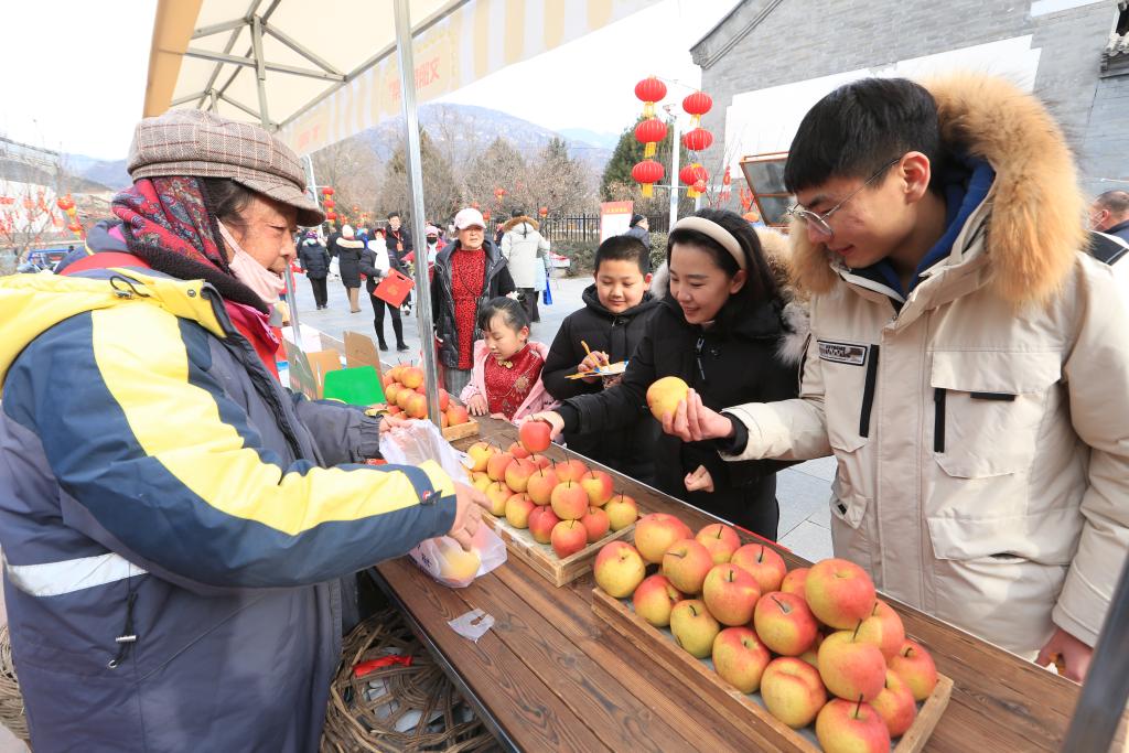 圖為游客在懷北古關(guān)迎春大集上購買紅肖梨。(北京市懷柔區(qū)供圖)