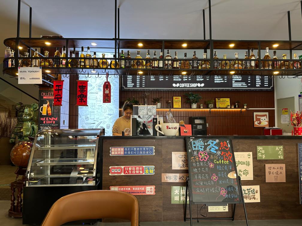 這頭集市熱鬧非凡,另一頭卻有一處鬧中取靜的去處。沿著河防口村主路走到村北,一棟米黃色的建筑格外亮眼,這里便是村里新開的咖啡館——雁棲湖新知咖啡廳。
