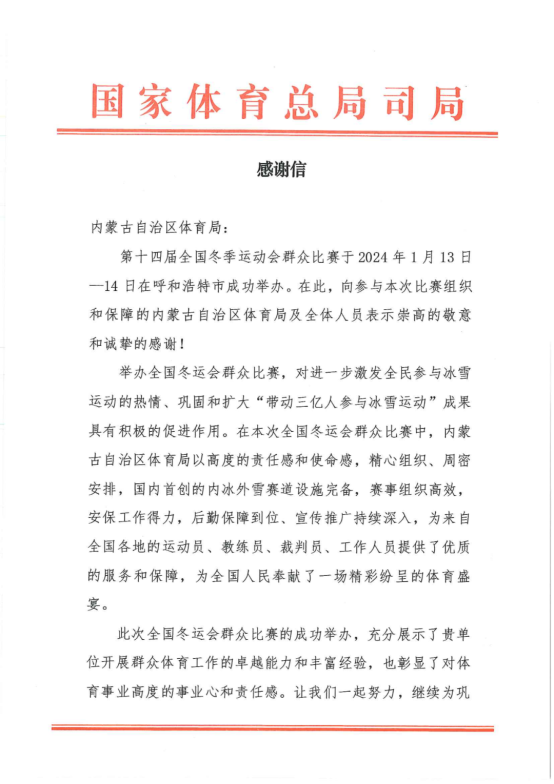 2月1日,國家體育總局群體司向內(nèi)蒙古自治區(qū)體育局發(fā)來感謝信,對內(nèi)蒙古自治區(qū)成功舉辦第十四屆全國冬季運動會群眾比賽表示充分肯定和高度贊揚。信中指出,舉辦全國冬運會群眾比賽,對進(jìn)一步激發(fā)全民參與冰雪運動的熱情、鞏固和擴(kuò)大“帶動三億人參與冰雪運動”成果具有積極的促進(jìn)作用。本屆賽事賽道設(shè)施完備,賽事組織高效,后勤保障到位,宣傳推廣持續(xù)深入,為全國人民奉獻(xiàn)了一場精彩紛呈的體育盛宴。希望在共同努力下,為鞏固和擴(kuò)大“帶動三億人參與冰雪運動”成果、推進(jìn)群眾冰雪運動發(fā)展做出更大的貢獻(xiàn)。