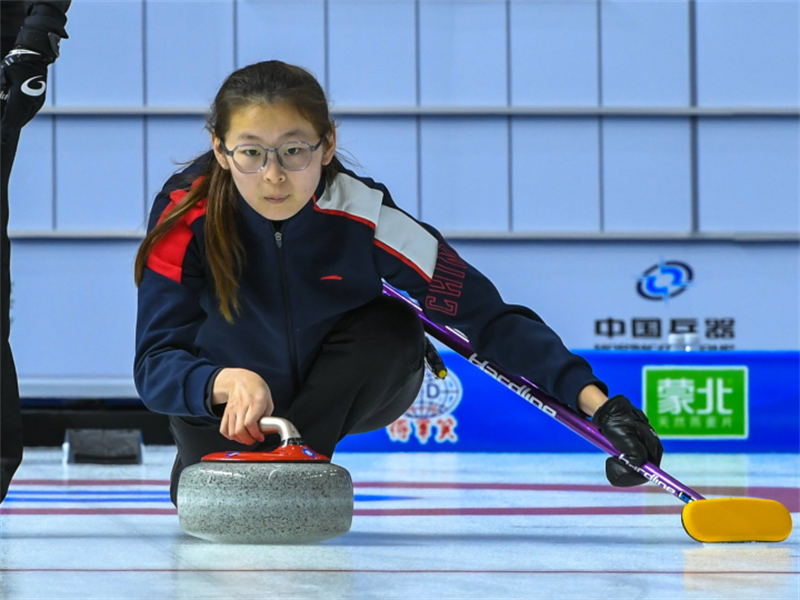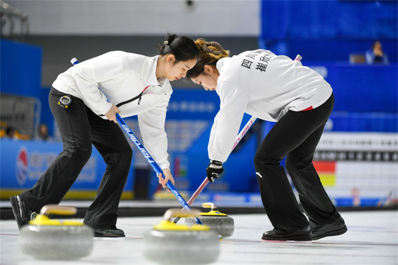 四川隊(duì)隊(duì)員在比賽中擲壺。