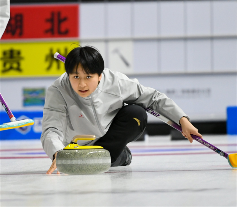 貴州隊(duì)隊(duì)員在比賽中擲壺。
