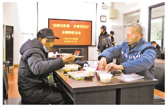 圖為軍天湖監(jiān)獄舉辦迎新春親情幫教活動現(xiàn)場,罪犯和家屬共進(jìn)“年夜飯”。
