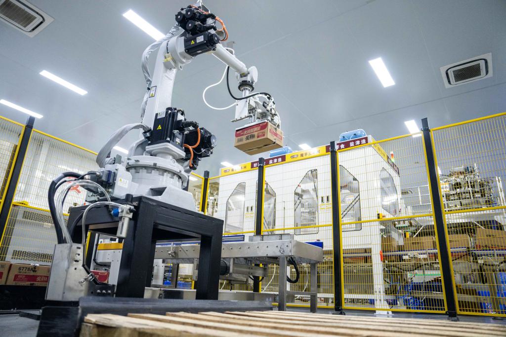 2023年11月23日,在瀏陽市大魔王魔芋食品生產(chǎn)車間,工業(yè)機(jī)器人在運(yùn)輸產(chǎn)品。新華社記者 陳思汗 攝