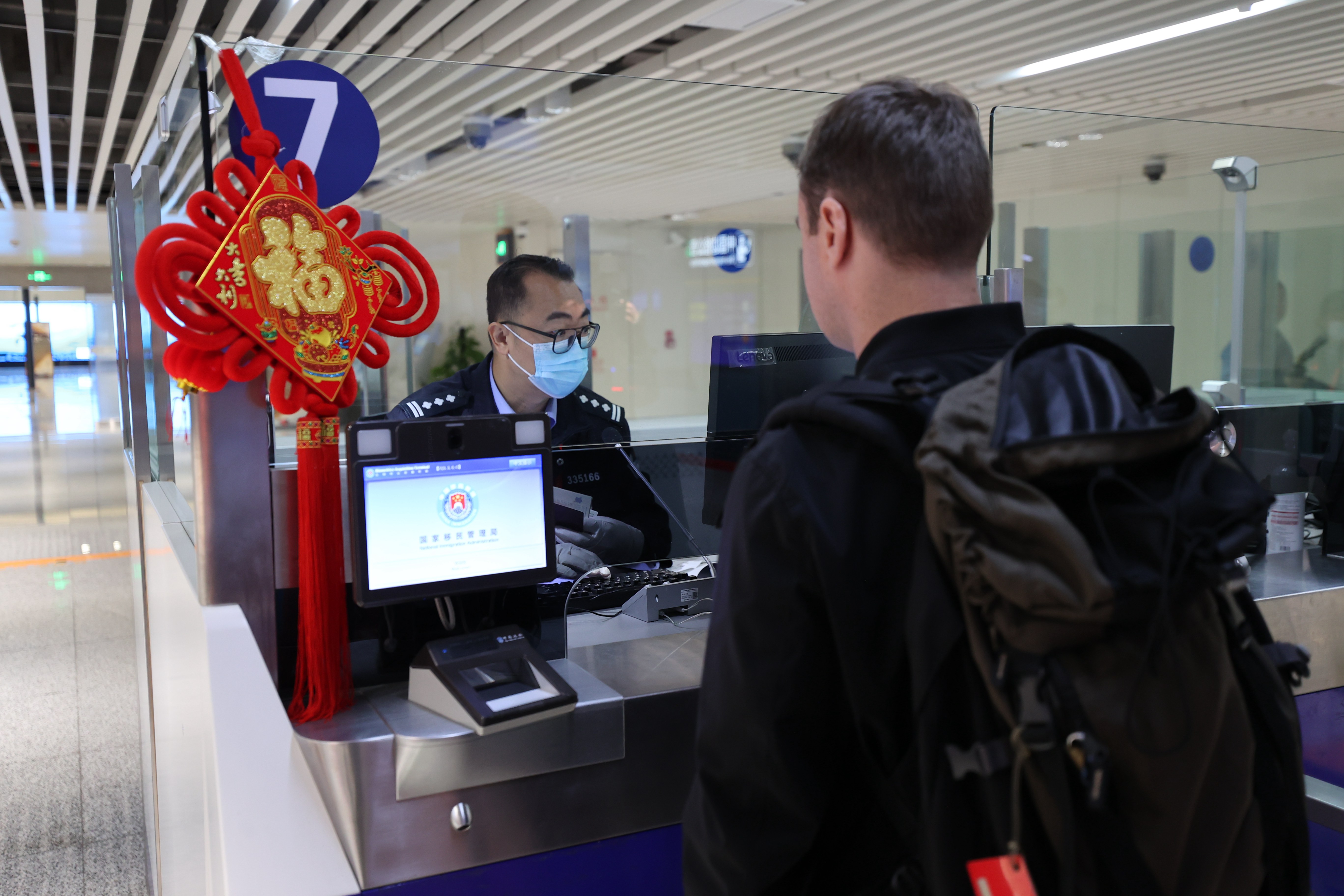 圖為執(zhí)勤民警譚運(yùn)清在引導(dǎo)入境旅客通關(guān)