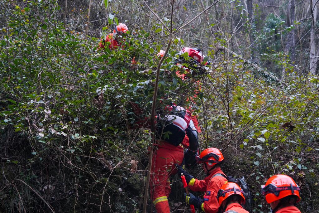森林消防員們正在互相協(xié)助穿越灌木。(甘肅省森林消防總隊(duì)供圖)