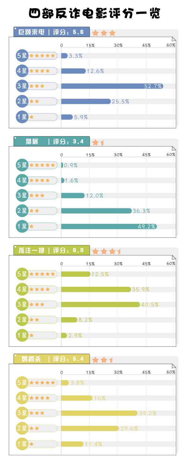 據(jù)豆瓣用戶對(duì)四部電影的評(píng)分,截至2024年2月1日,《孤注一擲》以總得分6.9位居四部電影之首,其余三部均在6分以下。分析評(píng)分構(gòu)成發(fā)現(xiàn),給出“三星”的網(wǎng)民不在少數(shù),“中規(guī)中矩”似乎成為了反電詐電影的標(biāo)簽。