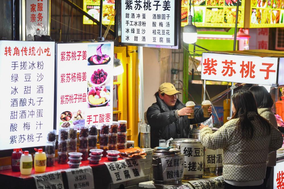 2月4日,在長沙市天心區(qū)裕南街街道的東瓜山夜市美食一條街,食客在一家“小店”購買小吃。新華社記者 陳澤國 攝