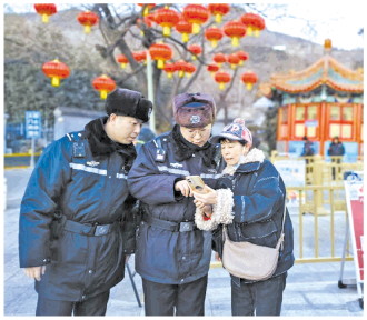 圖為石景山公安分局老山派出所民警在解答游客咨詢。