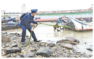 圖為巡邏時,楊秀青在海岸線檢查固定漁船纜繩。