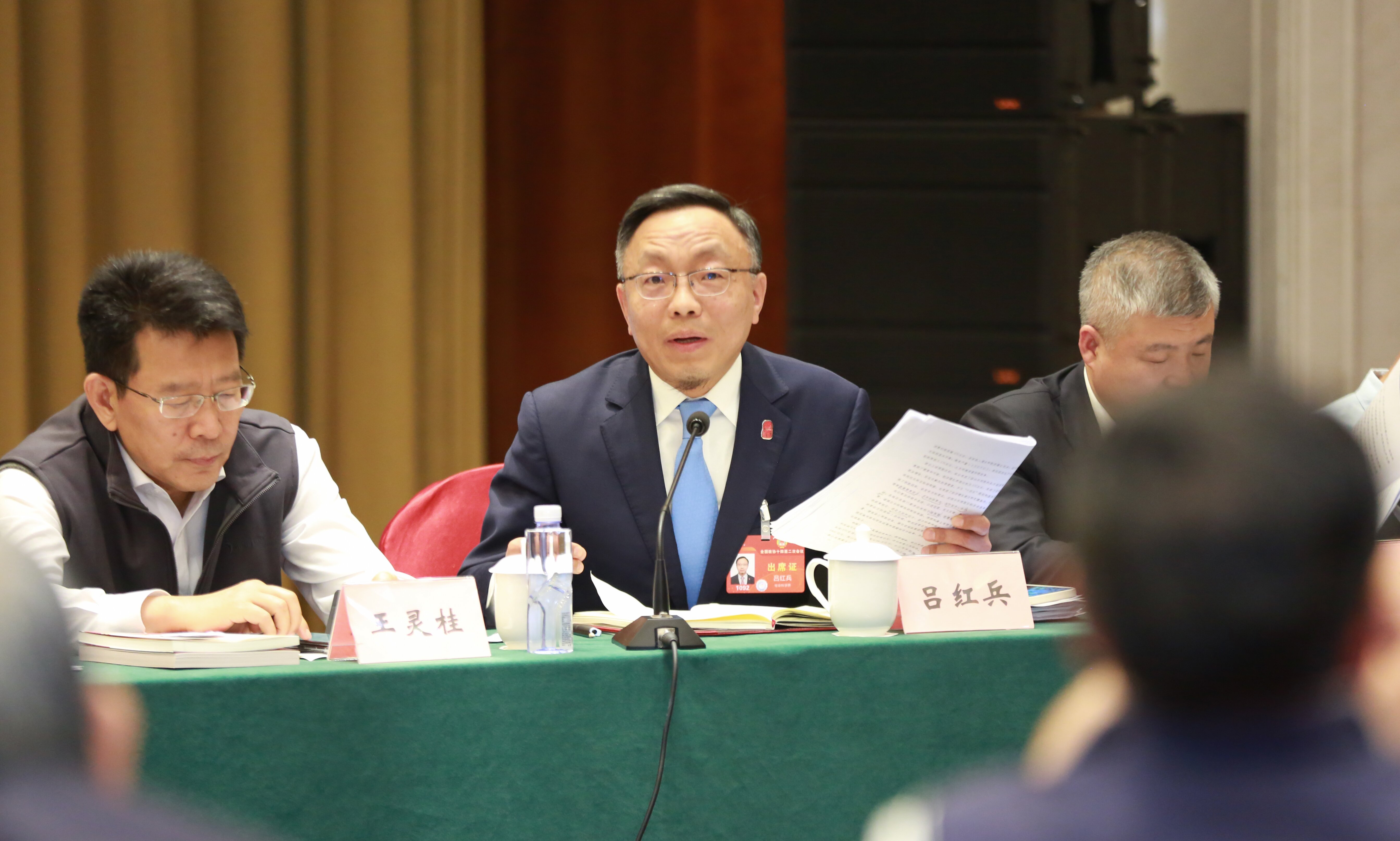 3月6日,參加全國政協(xié)十四屆二次會議界別聯(lián)組會議的中華全國律師協(xié)會監(jiān)事長呂紅兵委員(中)與參會委員交流。 本報記者 徐偉倫 攝