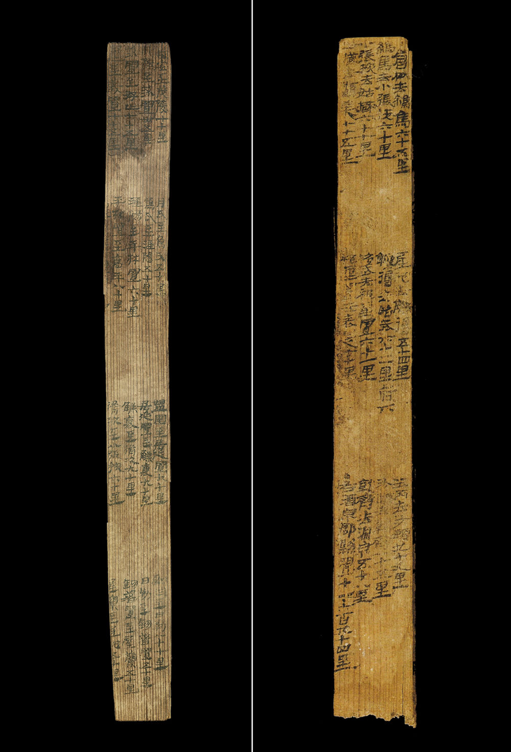 拼版照片:漢簡《居延里程簡》(左圖)和《懸泉里程簡》。1974年出土于今內蒙古自治區(qū)額濟納旗破城子遺址的“居延里程簡”,詳細記載了從漢代長安出發(fā)至張掖郡20個驛置名稱及間隔里程。1990年出土于敦煌懸泉置遺址的“懸泉里程簡”,記載了河西走廊地區(qū)武威郡到敦煌郡12個驛置的詳細信息。新華社發(fā)(甘肅簡牘博物館供圖)
