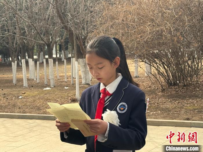 沈陽市寧山路小學(xué)學(xué)生在烈士墓碑前朗讀信件。李伶俐 攝