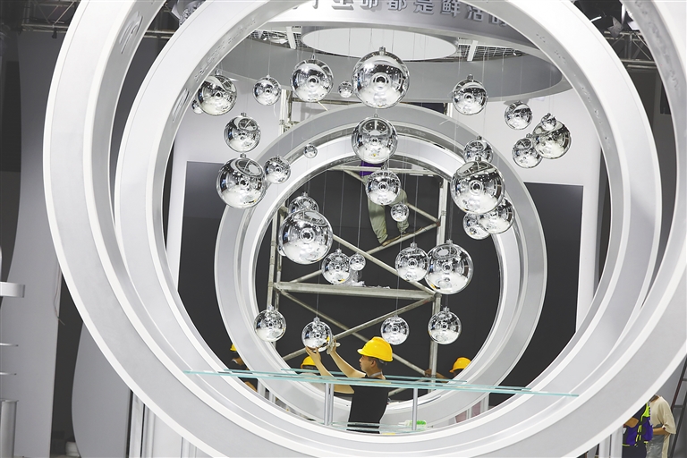 4月8日,第四屆消博會主會場,工人在搭建場館。邱肖帥 攝