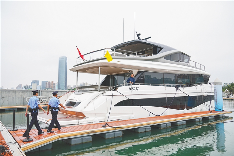 4月9日,??趪?guó)家帆船基地公共碼頭,第四屆消博會(huì)首艘進(jìn)境游艇靠港停泊。張茂 攝