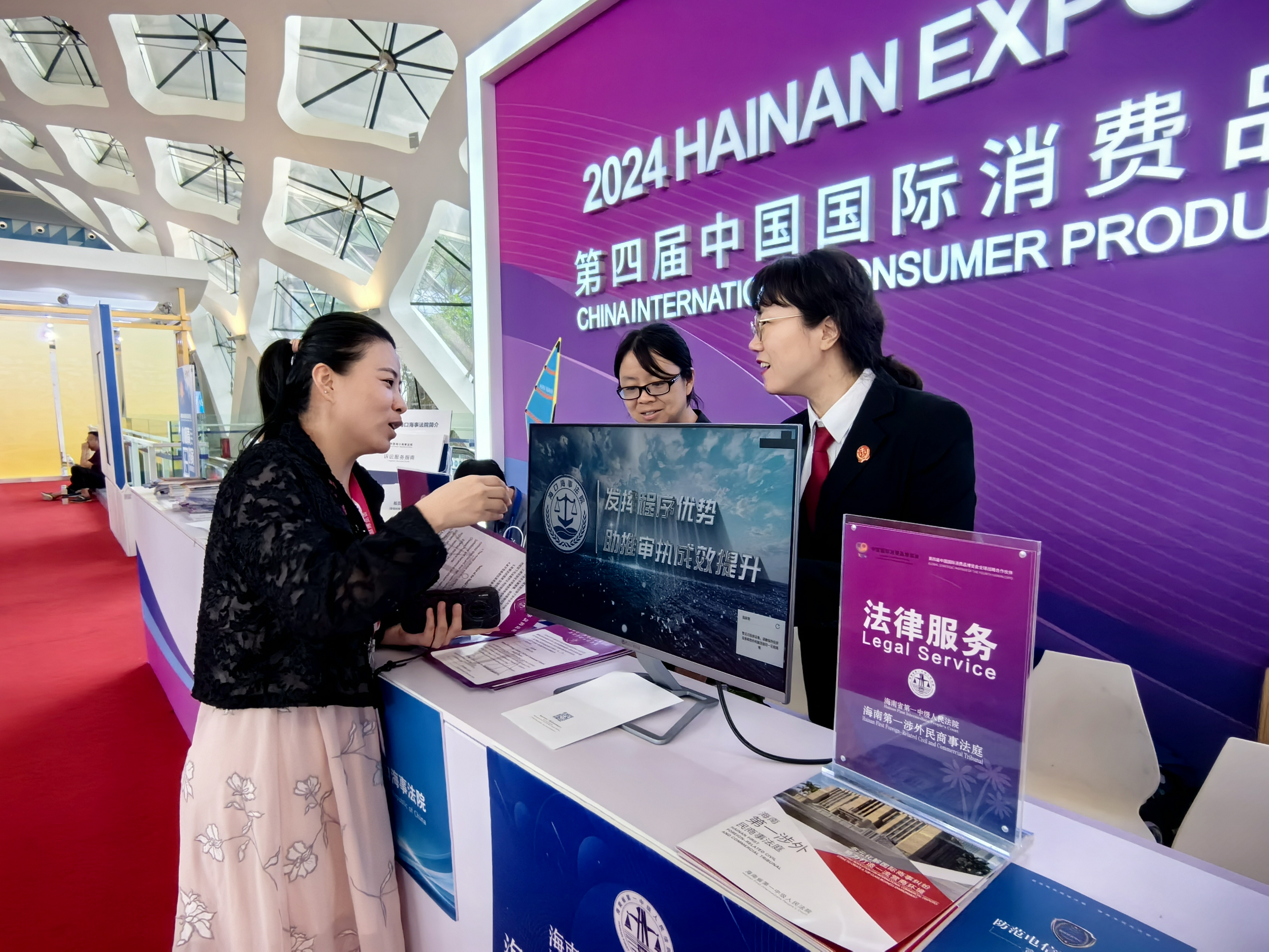 圖為法院工作人員在消博會(huì)綜合服務(wù)處司法服務(wù)窗口接受法律咨詢。