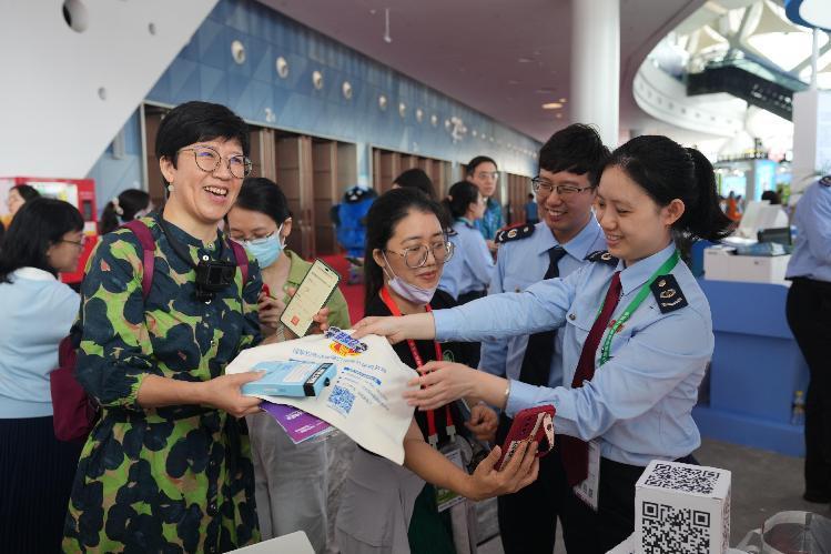 稅務(wù)干部指導(dǎo)參展商掃碼加入稅務(wù)服務(wù)微信群。海南省稅務(wù)局供圖