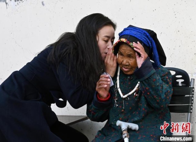 格西王姆(左)在馬爾康市敬老院與老年人聊天?!“苍?攝