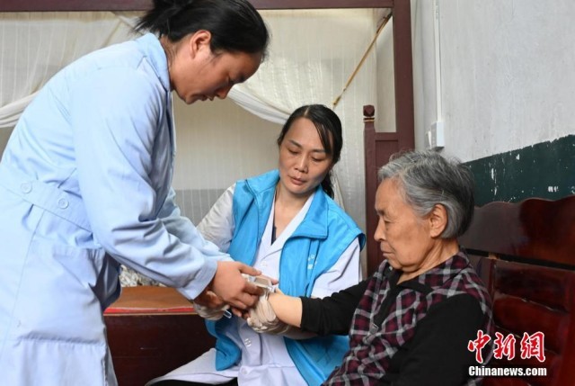 圖為福祿鎮(zhèn)衛(wèi)生院家庭醫(yī)生團(tuán)隊(duì)的醫(yī)務(wù)人員入戶為行動(dòng)不方便的村民進(jìn)行體檢。