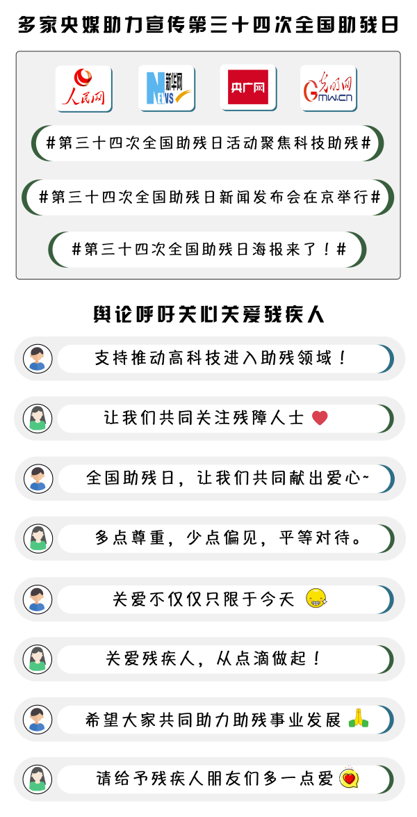 今年全國助殘日期間,各級(jí)殘聯(lián)聚焦開展豐富多樣的助殘活動(dòng),多家媒體對(duì)此進(jìn)行大力宣傳,引發(fā)輿論廣泛關(guān)注。綜合輿論來看,有的網(wǎng)民認(rèn)為,關(guān)心愛護(hù)殘疾人,切實(shí)維護(hù)殘疾人合法權(quán)益是社會(huì)發(fā)展的重要標(biāo)志;部分網(wǎng)民表示,科技助殘意義重大,其為殘疾人提供了更自主、更便利、更平等地融入社會(huì)的機(jī)會(huì),是實(shí)現(xiàn)社會(huì)融合的一種重要社會(huì)實(shí)踐;一些網(wǎng)民呼吁社會(huì)各界加大對(duì)殘疾人的關(guān)愛力度,多一些尊重,少一些偏見,平等對(duì)待殘疾人,讓每一天都是“助殘日”。
