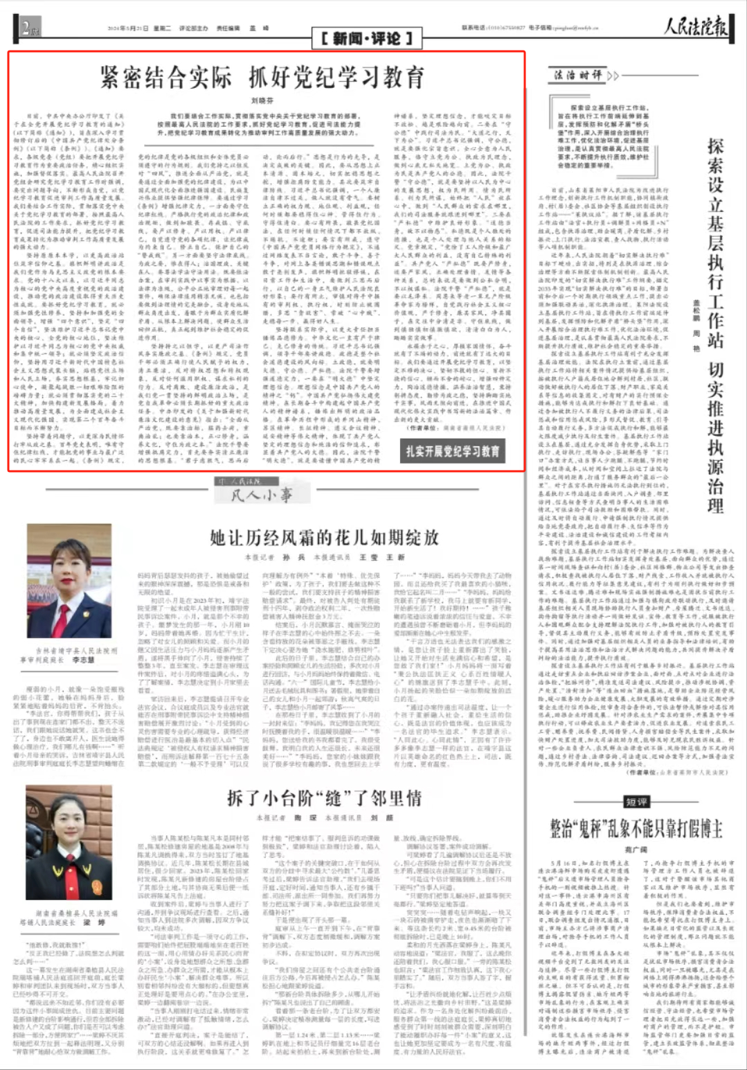 堅持帶著問題學,以更深為民情懷打牢從政之基。百年黨史表明,唯有守住紀律紅線,才能把黨的事業(yè)與最廣泛的民心牢牢系在一起。《條例》規(guī)定,黨的紀律是黨的各級組織和全體黨員必須遵守的行為規(guī)則。我們黨持之以恒反對“四風”,推進全面從嚴治黨,就是要通過全面加強黨的紀律建設(shè),為以中國式現(xiàn)代化全面推進強國建設(shè)、民族復(fù)興偉業(yè)提供堅強紀律保障。要通過學習《條例》增強紀律定力,一方面要守住紀律紅線。嚴格執(zhí)行黨的政治紀律和政治規(guī)矩,做到知敬畏、存戒懼、守底線,要嚴以修身、嚴以用權(quán)、嚴以律己,自覺遵守黨的各項紀律,讓紀律成為約束自己、修正自己、保護自己的“警戒線”。另一方面要堅守法律底線。為政之要,惟在得人;治國理政,關(guān)鍵在人。要尊法學法守法用法。既要依法辦案,在審判實踐中以事實為根據(jù)、以法律為準繩,公平公正地審理好每一起案件,確保法律適用精準無誤,也包括要做到法理情的完美融合,設(shè)身處地從群眾角度出發(fā),著眼于為群眾實質(zhì)化解矛盾、從根本上解決問題,使群眾生活回歸正軌,真正起到維護社會穩(wěn)定的促進作用。