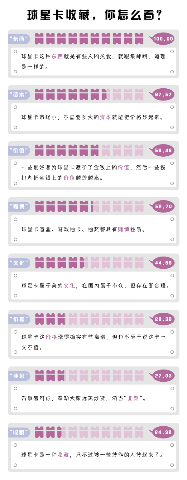 面對話題熱度與價值不斷攀升的球星卡,有的網(wǎng)友認為球星卡收藏跟集郵是一個道理,熱愛無需理由,存在即合理;有的網(wǎng)友則表示,“天價”球星卡背后存在資本運作,炒作球星卡已經(jīng)成為某些人的斂財手段;也有網(wǎng)友呼吁大家理性消費,勿盲目跟風、投機倒把,別被市場當成“韭菜”。
