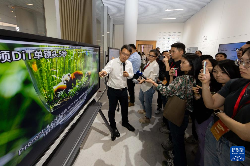 5月23日,大模型企業(yè)、智象未來(lái)生態(tài)合作部總經(jīng)理沈偉峰為采訪團(tuán)介紹運(yùn)用大模型文生視頻。新華社記者 王翔 攝