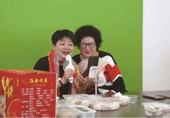 肢體殘疾人徐良云(左)在海安市扶殘助農(nóng)直播基地推銷海安特產(chǎn)