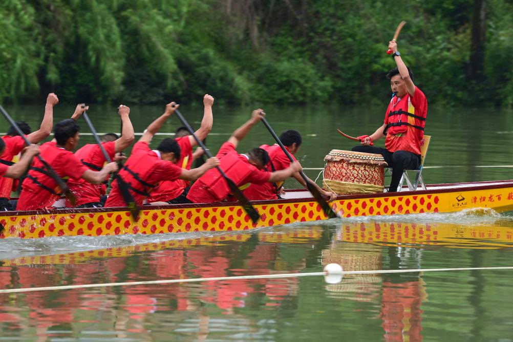 5月29日,在酉陽縣龍?zhí)舵?zhèn),龍舟隊在水面角逐。