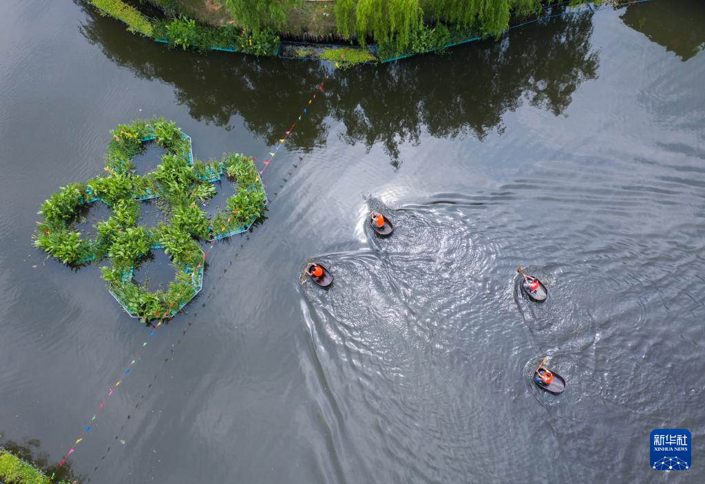5月25日,村民們參加水鄉(xiāng)劃菱桶比賽。菱桶是河網(wǎng)密布的東林鎮(zhèn)百姓家中常見的一種傳統(tǒng)水上勞動(dòng)工具,村民在捕魚、采菱、采荷時(shí)都要用到(無人機(jī)照片)。