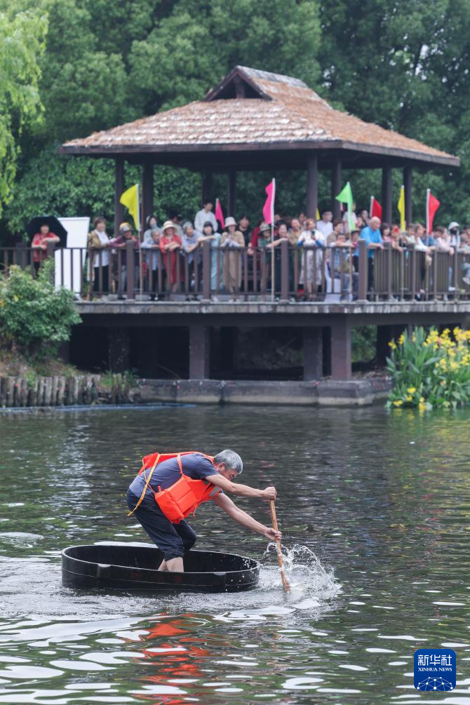 當(dāng)日,浙江省湖州市吳興區(qū)東林鎮(zhèn)舉辦“慶端午 劃菱桶”水鄉(xiāng)端午趣味民俗活動(dòng),來(lái)自東林鎮(zhèn)各村的村民們?cè)谌娲鍏⒓恿怂l(xiāng)劃菱桶比賽、荷塘釣小龍蝦、做艾草花束、包粽子等端午趣味民俗活動(dòng),在初夏時(shí)節(jié)呈現(xiàn)江南水鄉(xiāng)特有的迎端午氣氛。