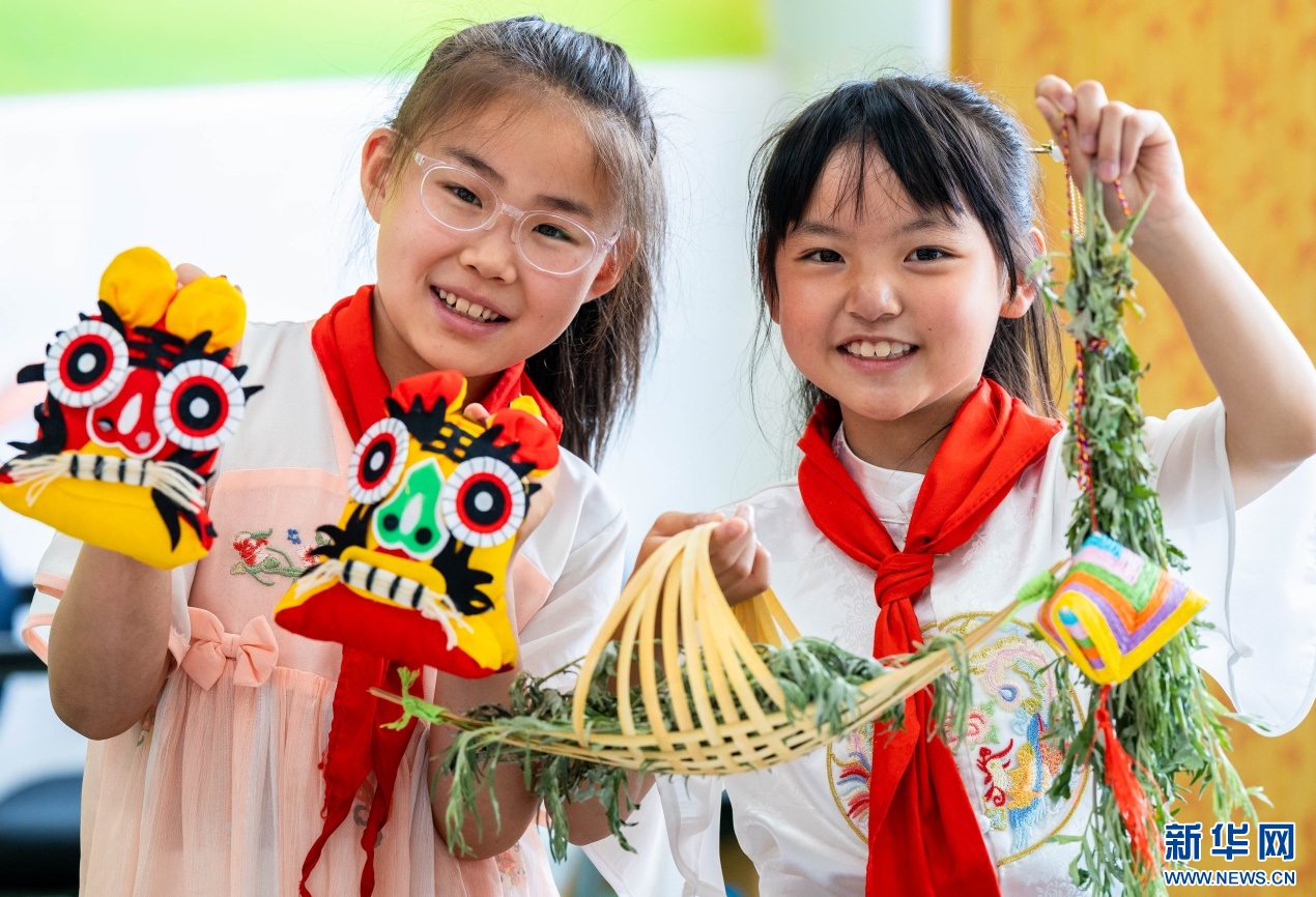 6月6日,呼和浩特市玉泉區(qū)通順街小學(xué)學(xué)生在“我們的節(jié)日·端午”主題活動(dòng)上展示布老虎、香囊和裝有艾草的竹船。新華網(wǎng)發(fā)(丁根厚 攝)