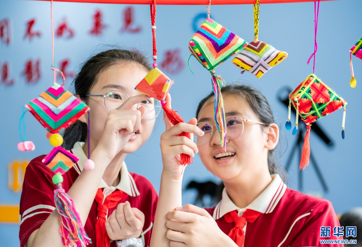 6月4日,呼和浩特市玉泉區(qū)恒昌店巷小學(xué)學(xué)生在欣賞制作完成的“七彩粽子”香囊。新華網(wǎng)發(fā)(丁根厚 攝)